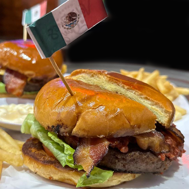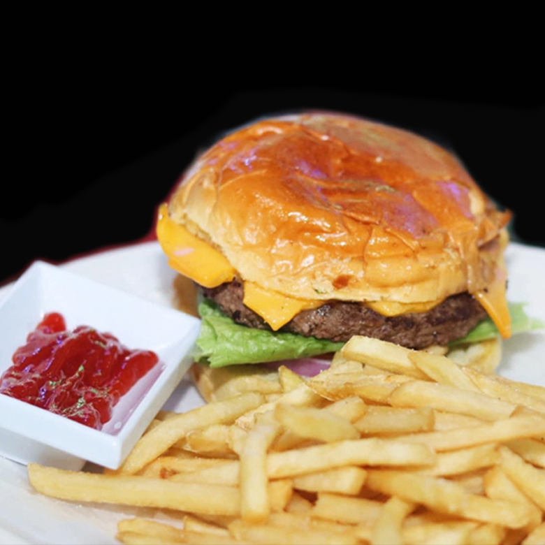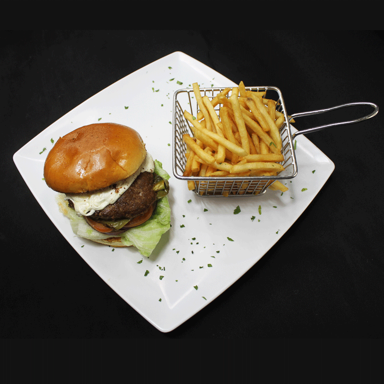 Lettuce, onion, tomatoe, american cheese with bacon and french fries