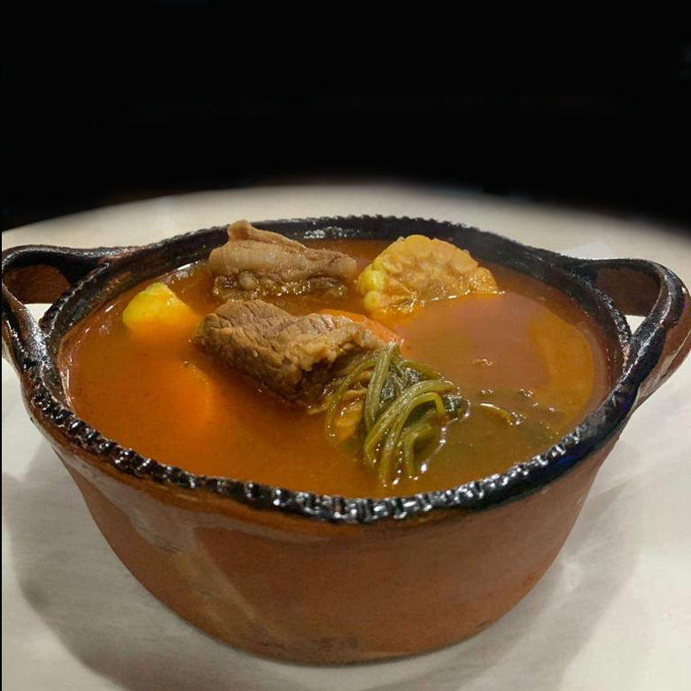 Lime, chives, cactus and radish, cotija cheese, slow roasted beef and consome
