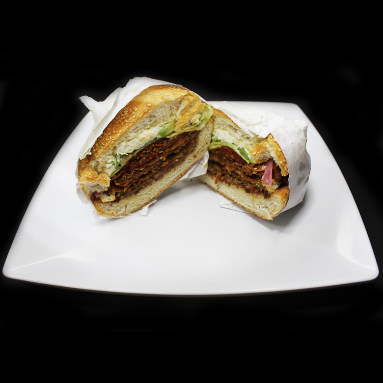 Cemita bread, Beans, avocado, papalo, tomatoe, onion, oaxaca cheese, chipotle pepper, mayonaise, Breaded beef or chicken