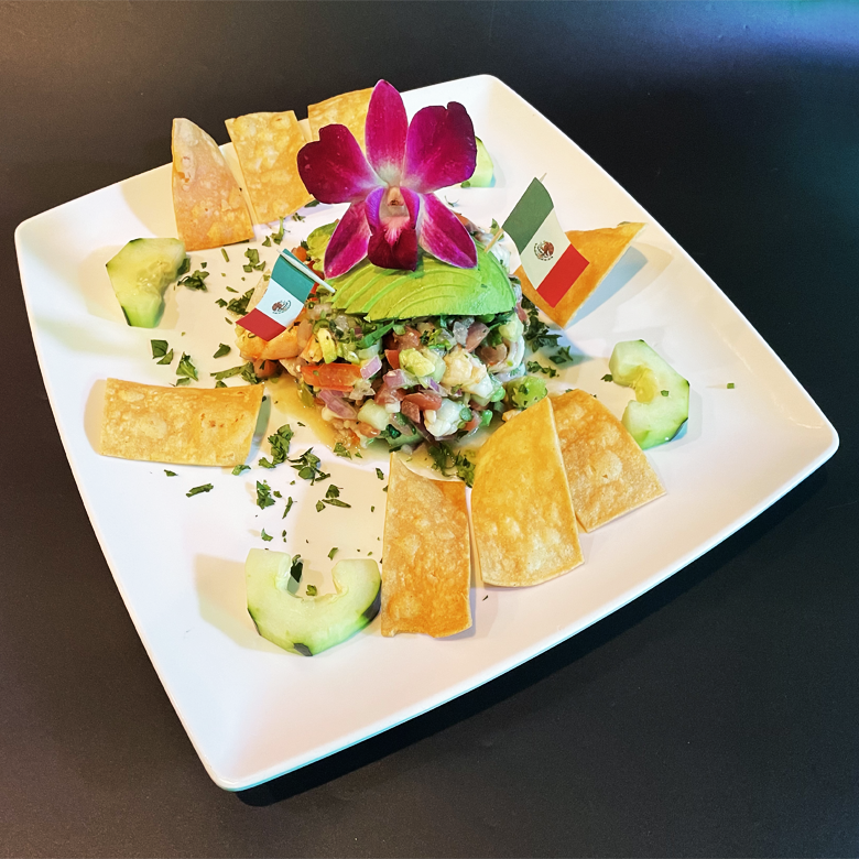 Shrimp, Octopus, avocado, cilantro, red onion, tomatoes, lime juice, cucumber, serrano pepper, salt and pepper.