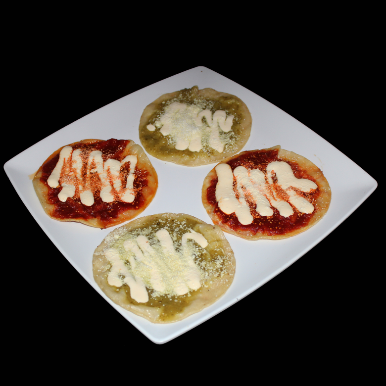 Tortilla with red or green sauce, onion, sour cream and shredded cotija cheese, any meat (Price per piece)