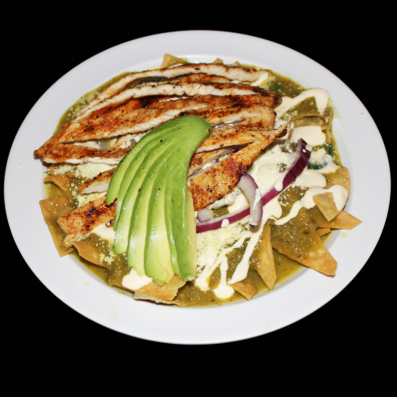 Tortilla chips, red or green sauce, onion, sour cream, cotija cheese, with meat