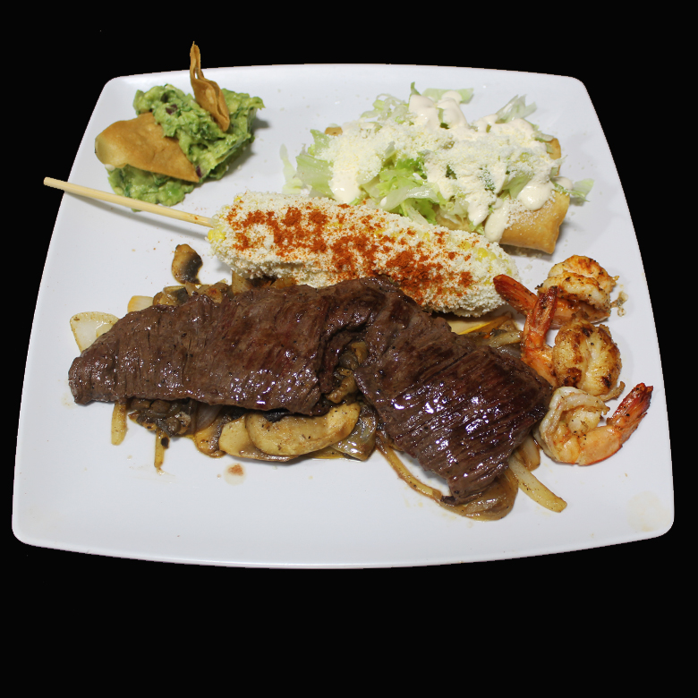 Skirt steak, corn, taco dorado, shrimp, guacamole.