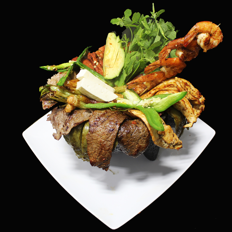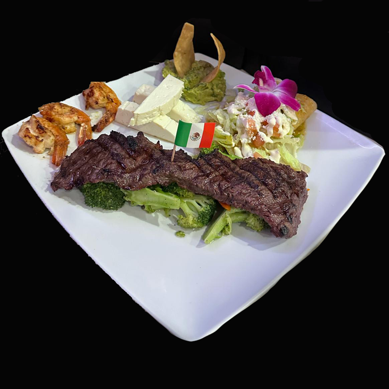 Skirt steak, shrimp, avocado, vegetables, mexican cheese, green enchiladas with chicken.