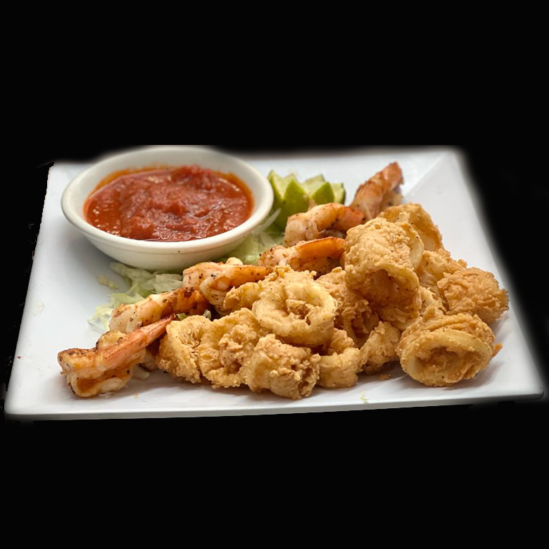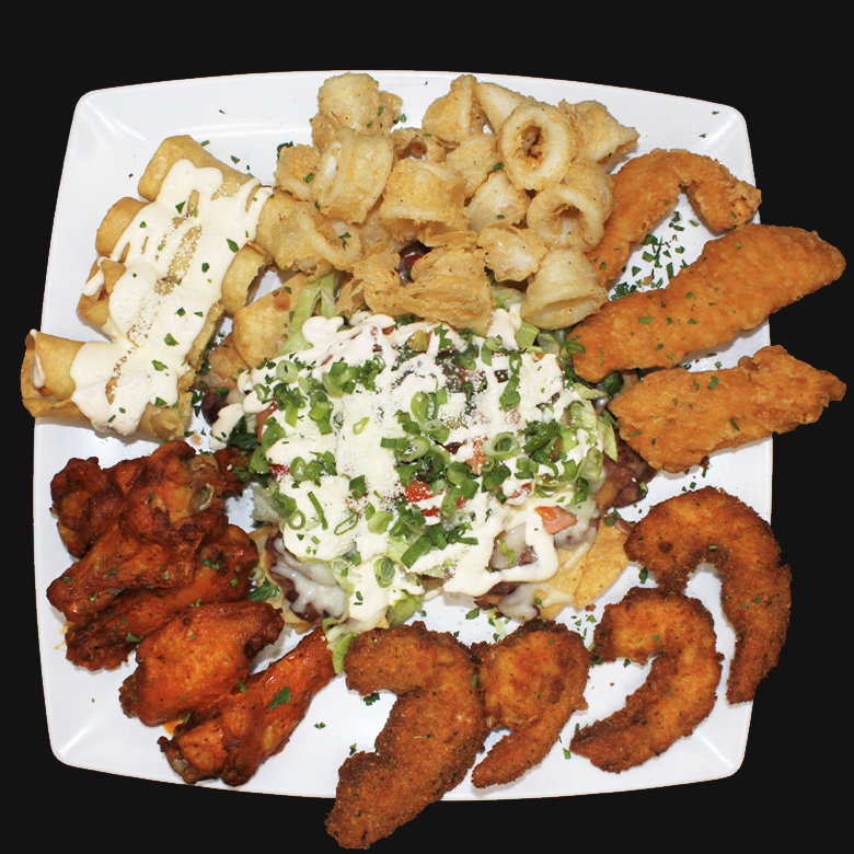 Wings,Chicken tenders,Bredded Shrimp, Breded Calamari, Nachos & taquitos dorados.