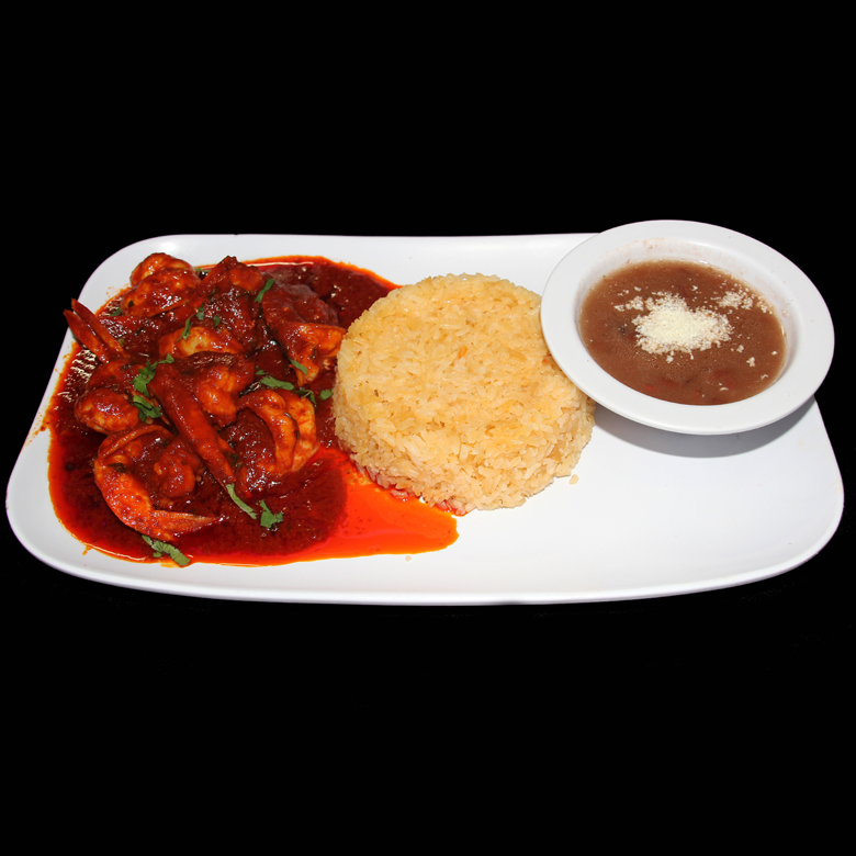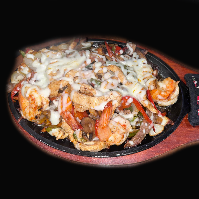 Red and green peppers, mushrooms, onions, shrimp, steak and chicken, rice & beans