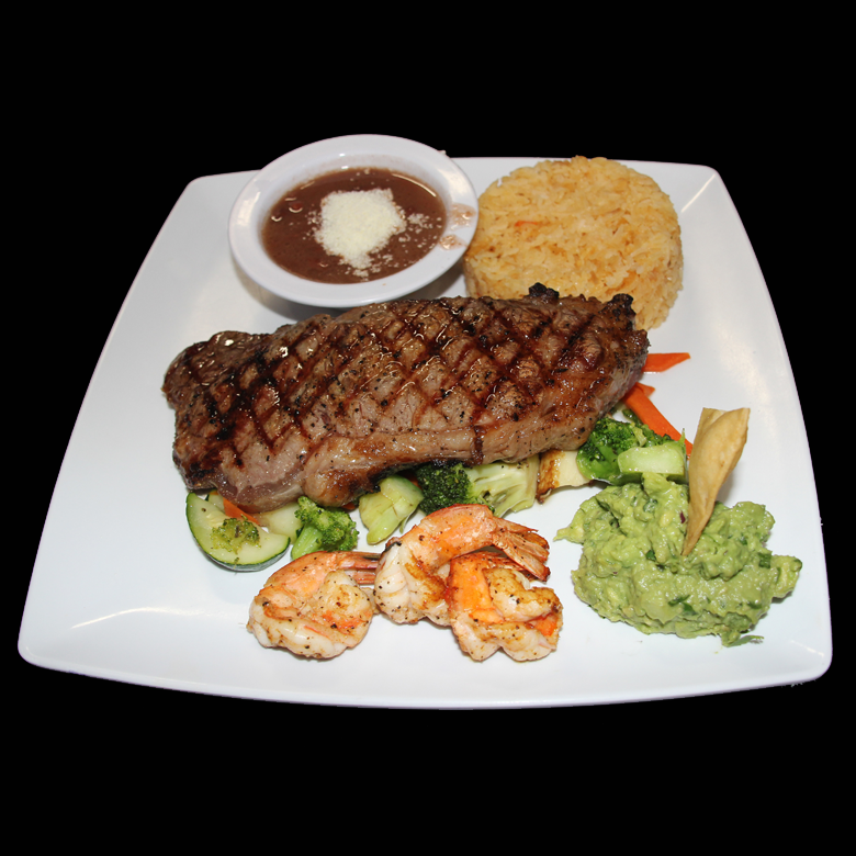 Ribeye steak, shrimp, vegetables, guacamole, rice & beans