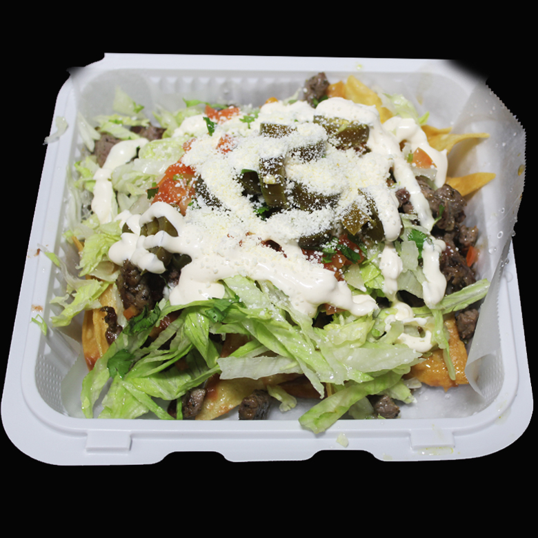 Tortilla chips, beans, mozarella cheese, lettuce, onion, tomatoe, jalapeño pepper, sour cream, shredded cheese, Scallion with meat.