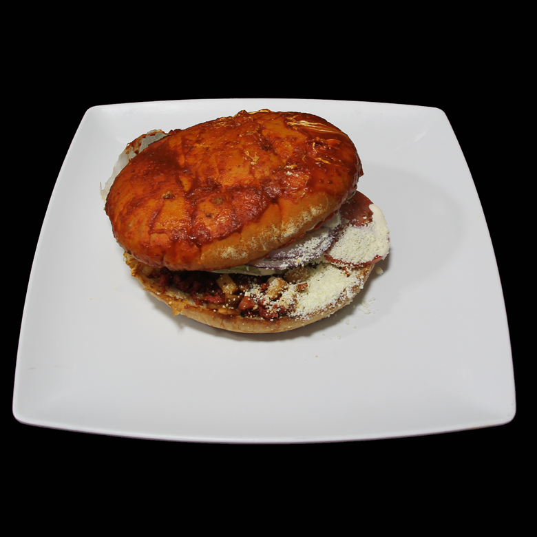 Beans, scramble egg, Cesina, lettuce, tomatoe, onion, oaxaca cheese, jalapeño, mayonaise, Ham, Roast pork, Breaded steak,pork.