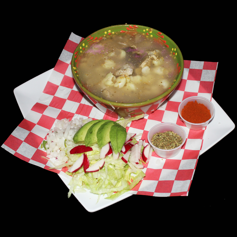 Corn, lettuce, soup with pork, on the side tostada, oregano, lime, chile.