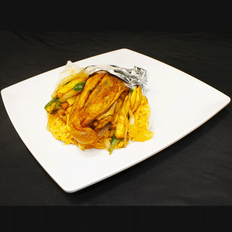 Jalapeño pepper toreado, rice, slices fries, onion, breaded chicken