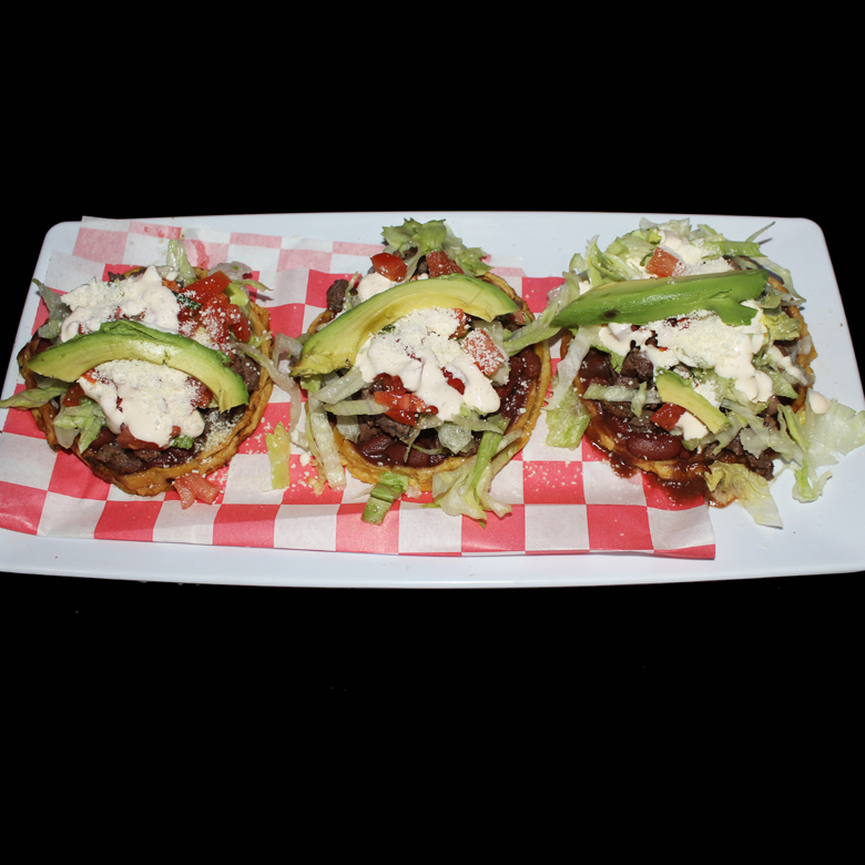 Hand made corn tortilla, lettuce, pico de gallo, avocado side lettuce, onion, sour cream, melted cheese, with meat.