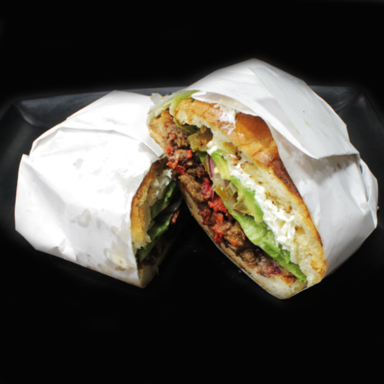 Beans, lettuce, tomatoe, onion, oaxaca cheese, jalapeño, mayonaise, steak and chorizo